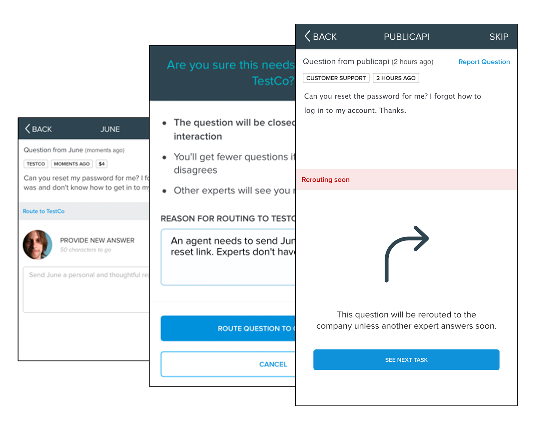 When an expert encounters a question that clearly needs to be handled by the company — like a question that involves billing, for instance — that expert can reroute it more easily without providing additional information.