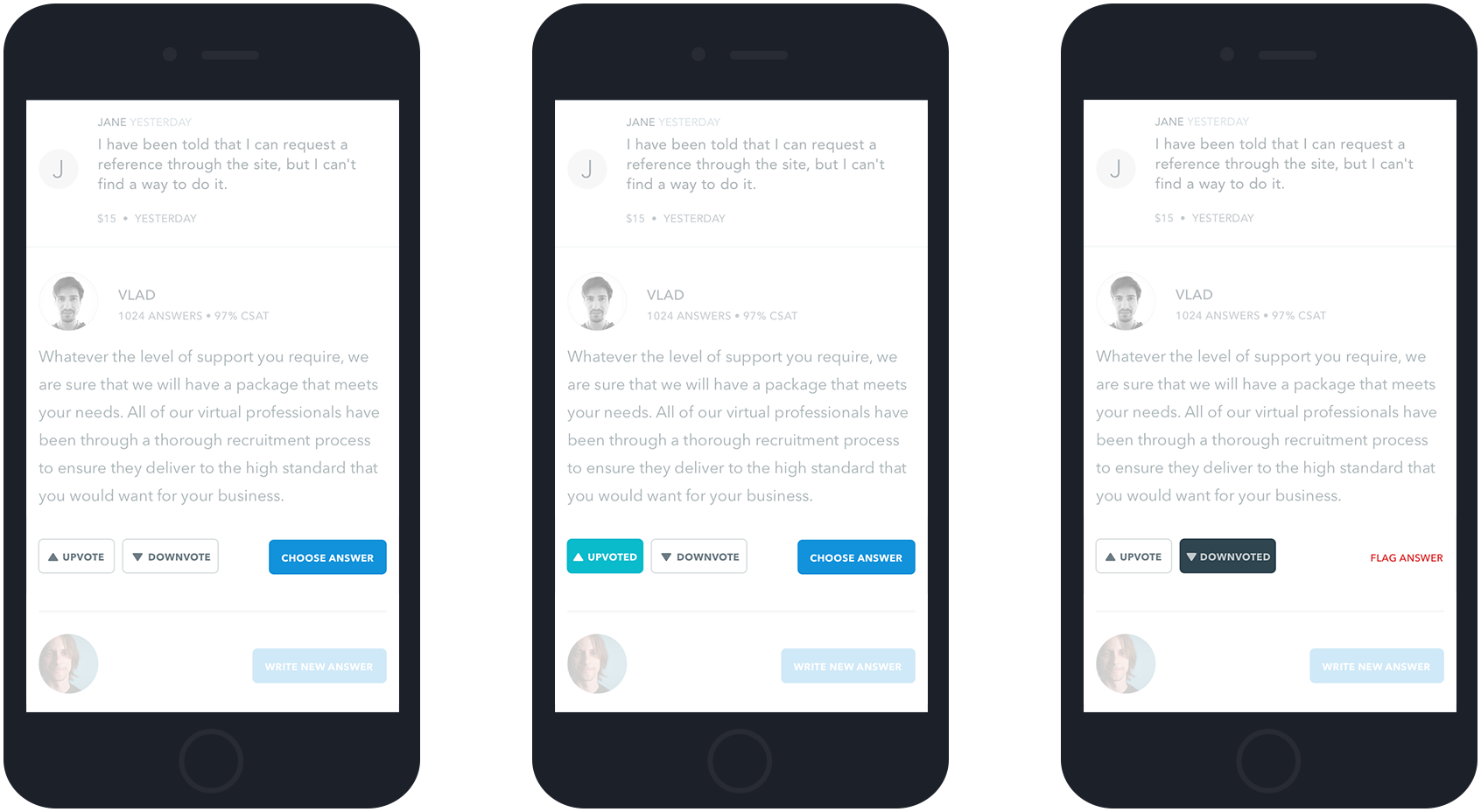 A special mention goes to the downvote button which hides the “choose answer” option and gives the expert the opportunity to flag the downvoted answer. Flagging helps moderators spot answers that need special attention and experts who may need coaching.